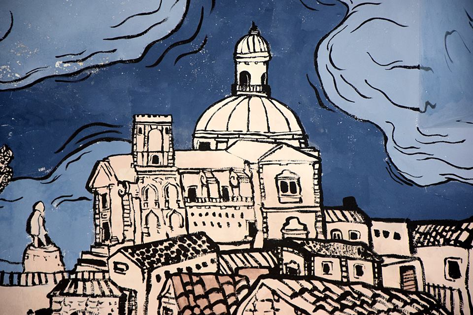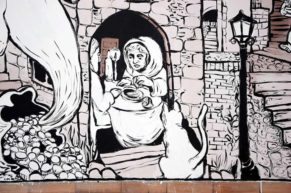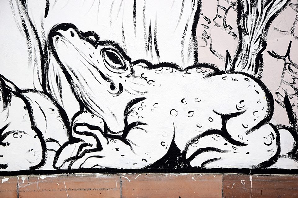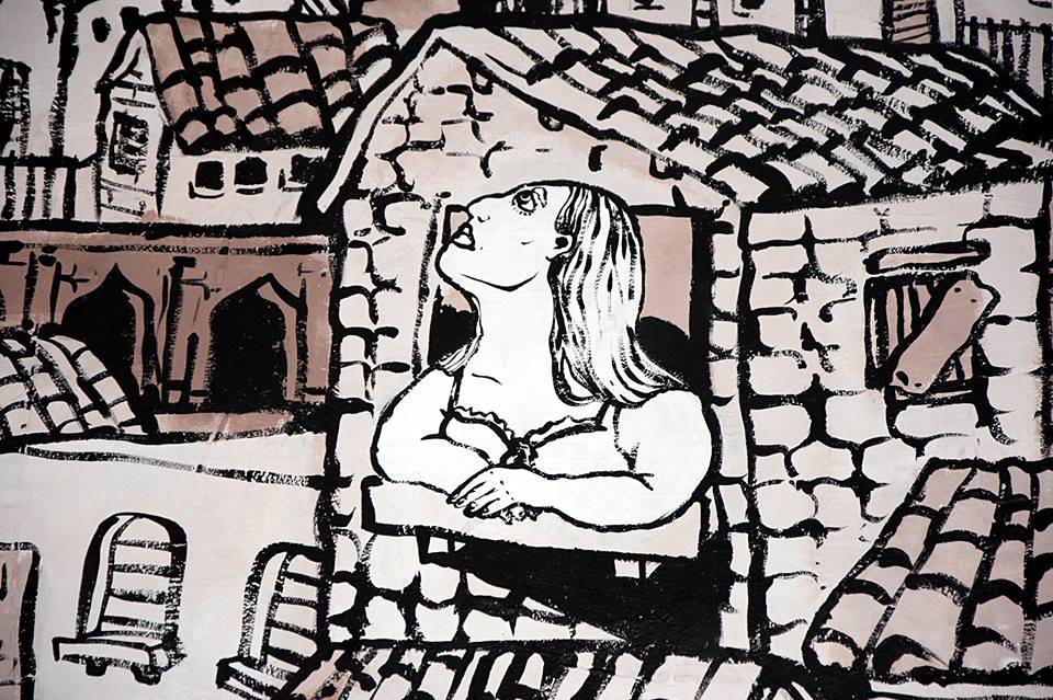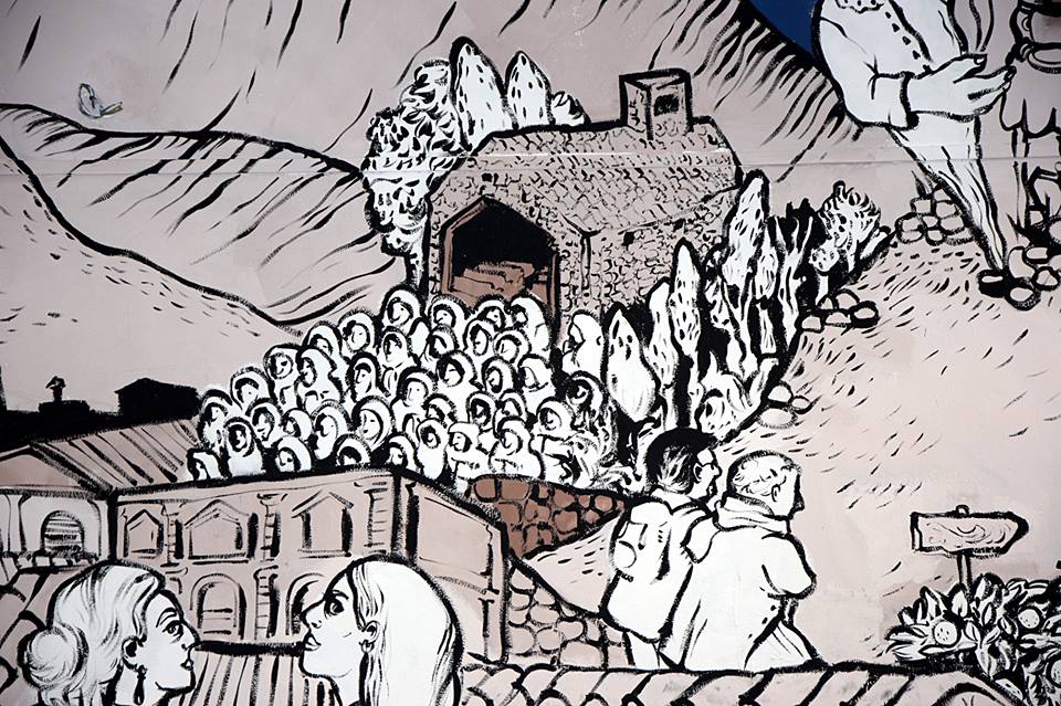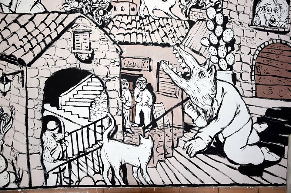 dettagli del murales Fiabe e leggende piazzesi, vernice ad acqua su parete. Centro espositivo Monte Prestami, Piazza Armerina EN, Aprile 2015.