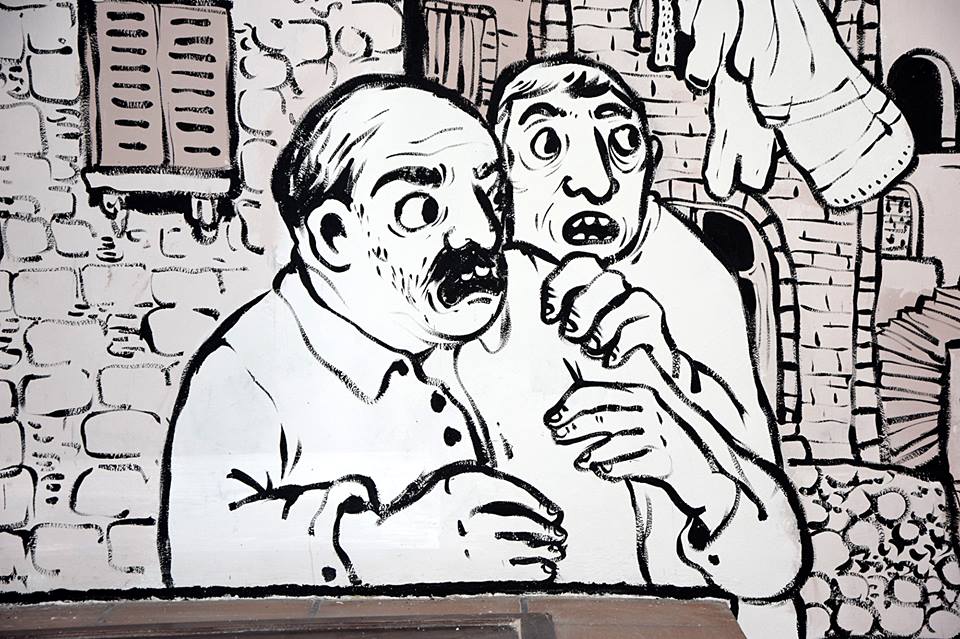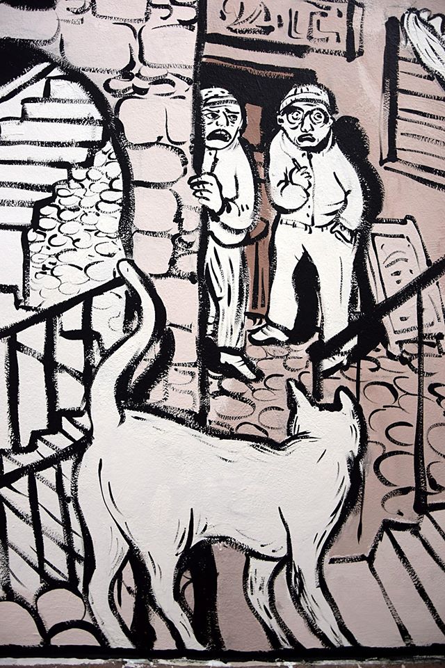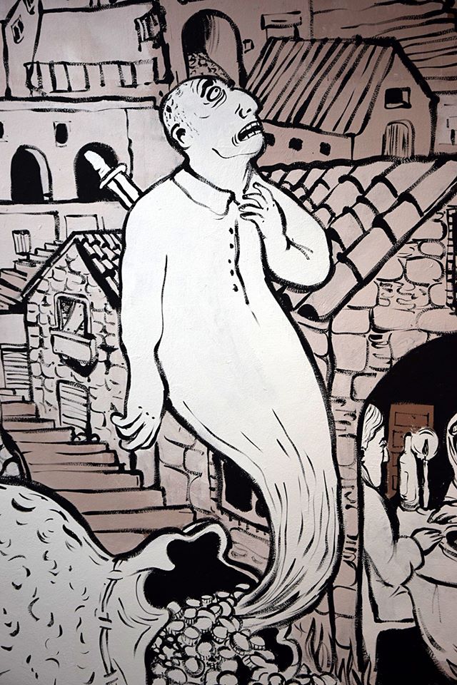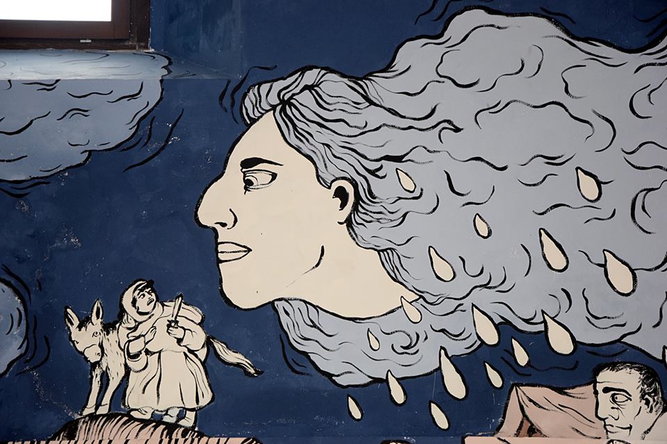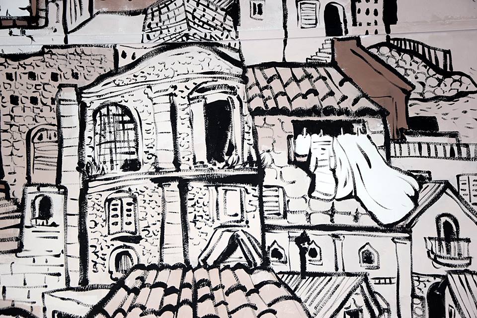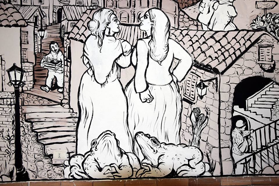 dettagli del murales Fiabe e leggende piazzesi, vernice ad acqua su parete. Centro espositivo Monte Prestami, Piazza Armerina EN, Aprile 2015.