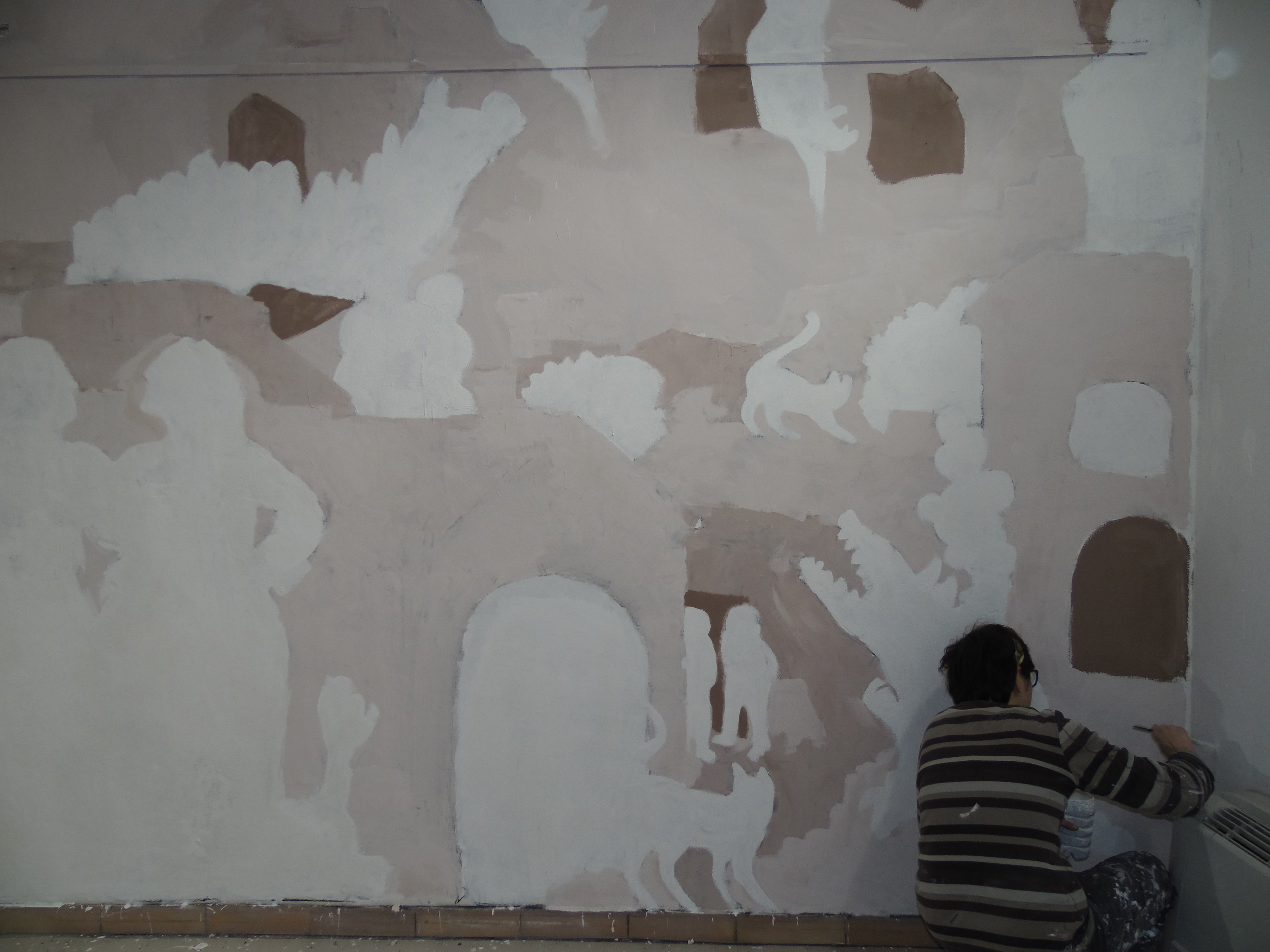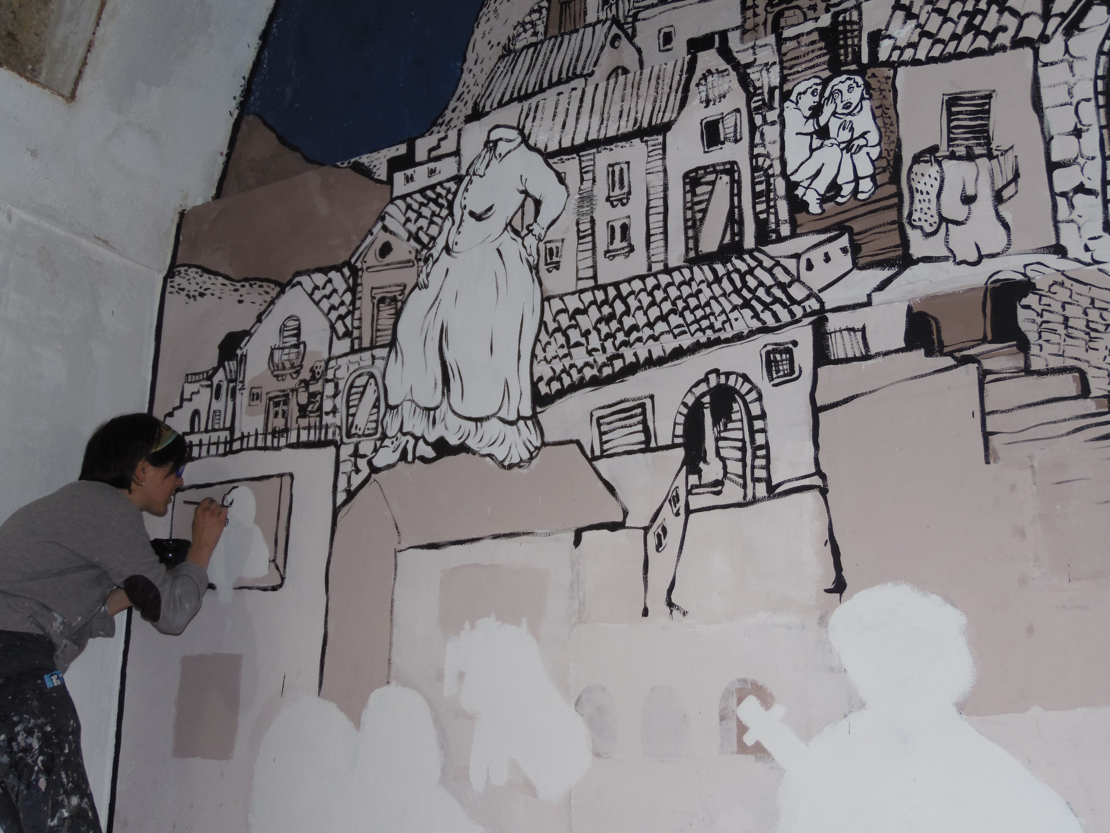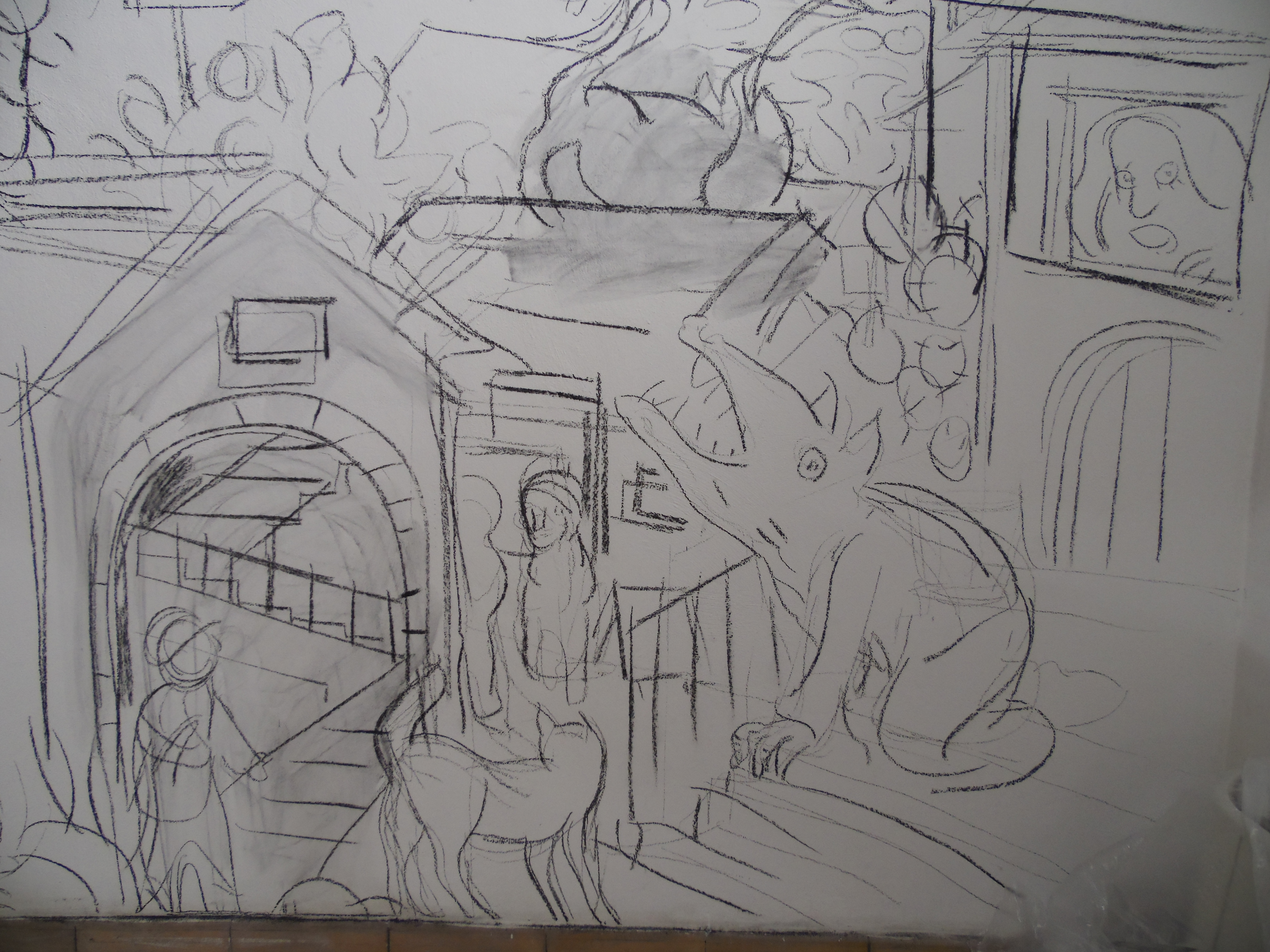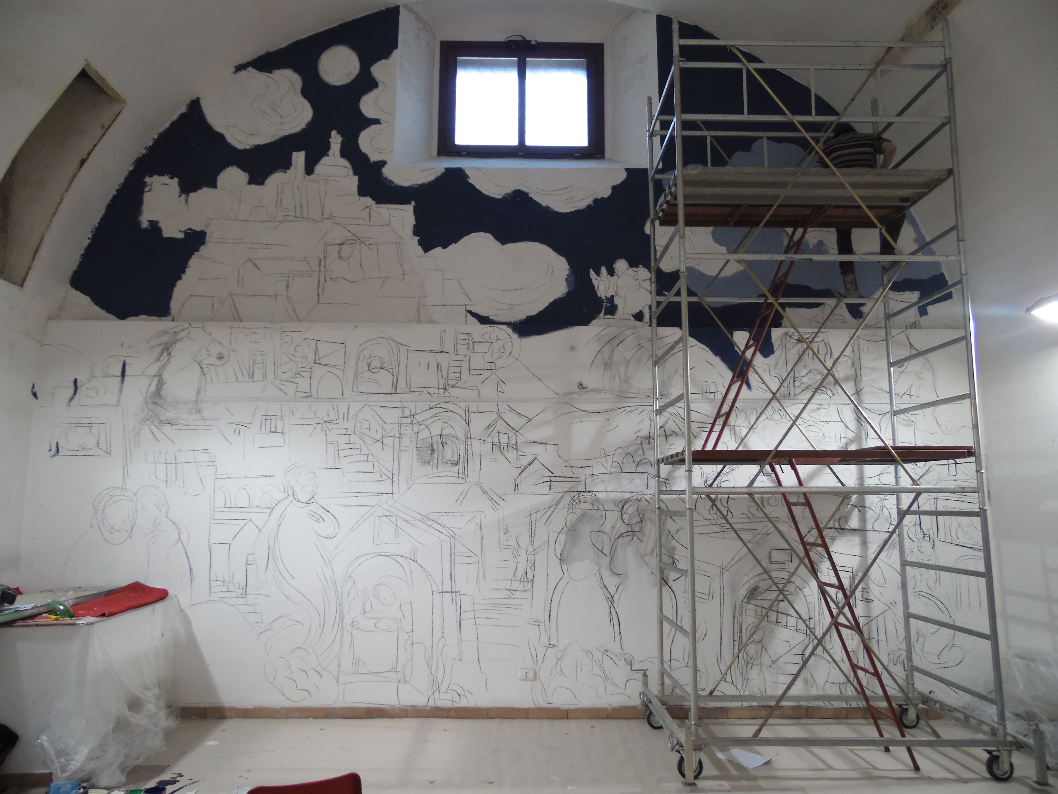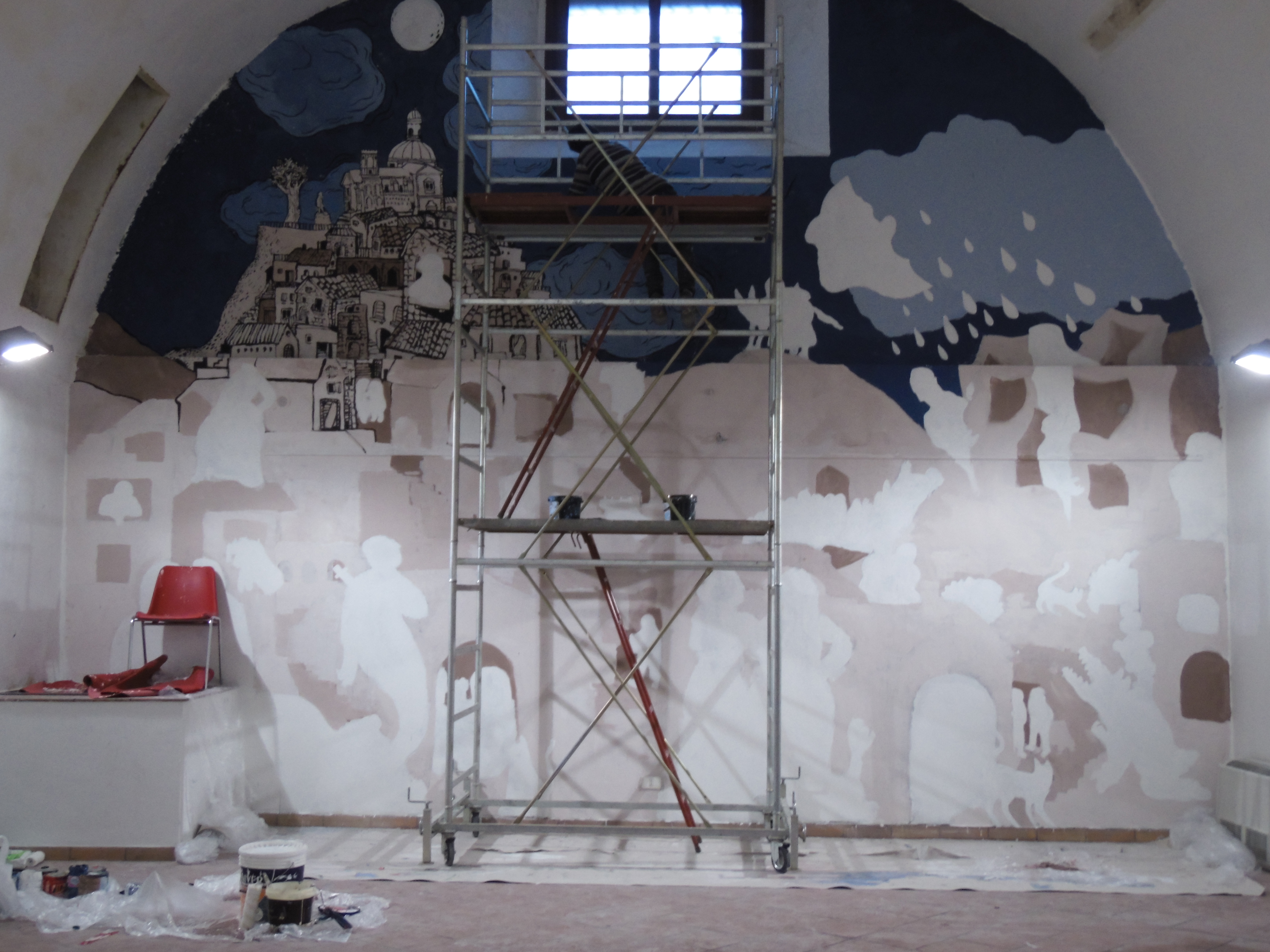 Fiabe e leggende piazzesi fasi del lavoro: disegno preparatorio e colore. Murales, vernice ad acqua su parete. Centro espositivo Monte Prestami, Piazza Armerina EN, Aprile 2015.