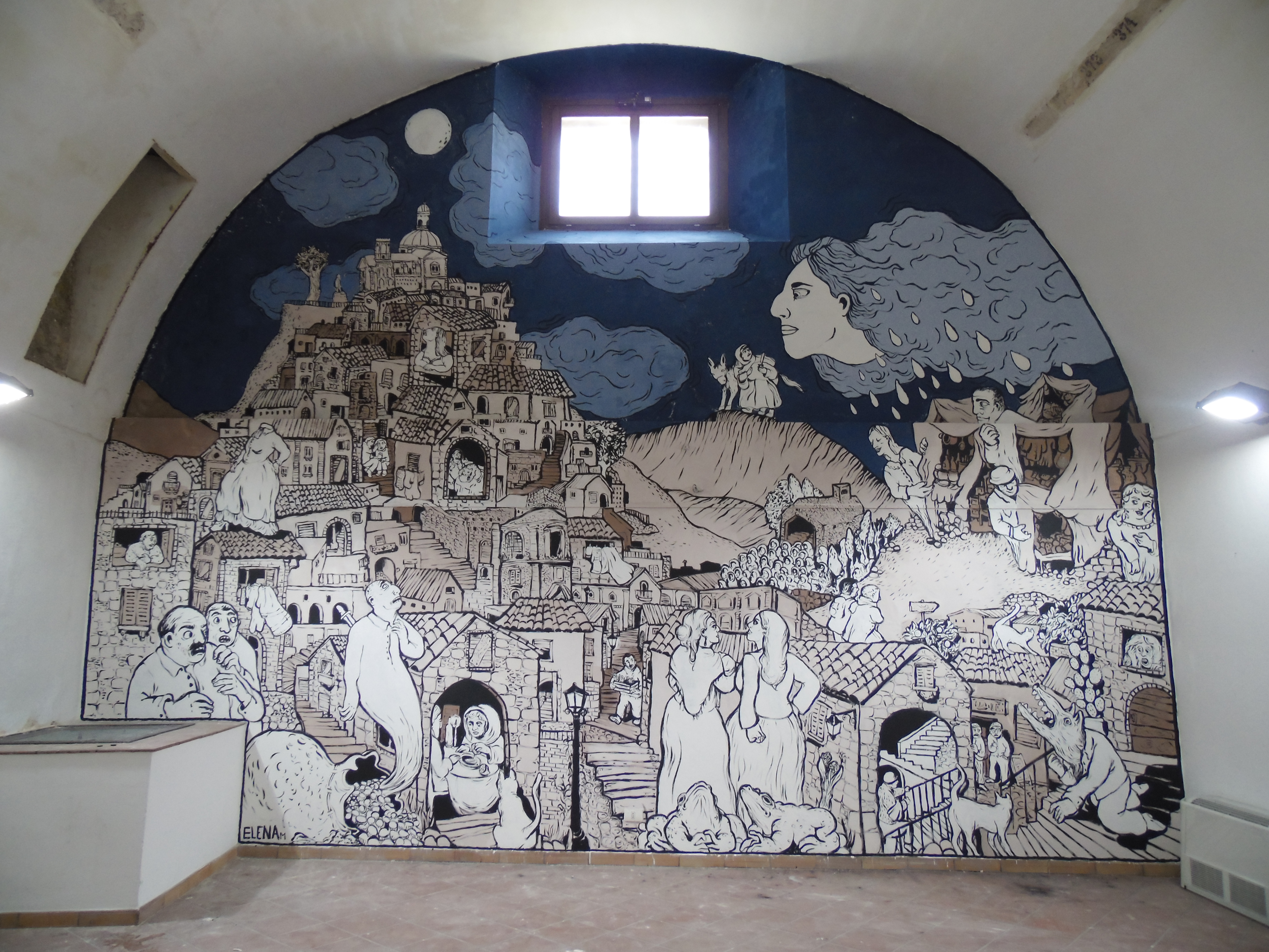 Fiabe e leggende piazzesi, vernice ad acqua su parete. Centro espositivo Monte Prestami, Aprile 2015