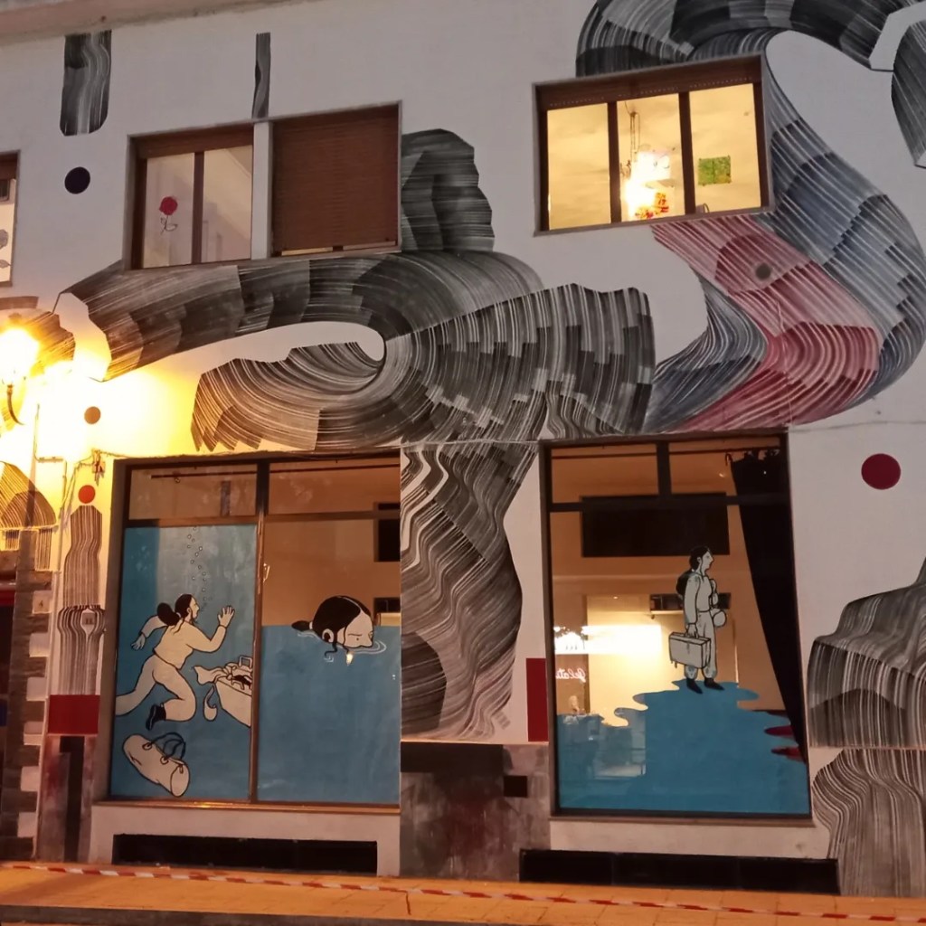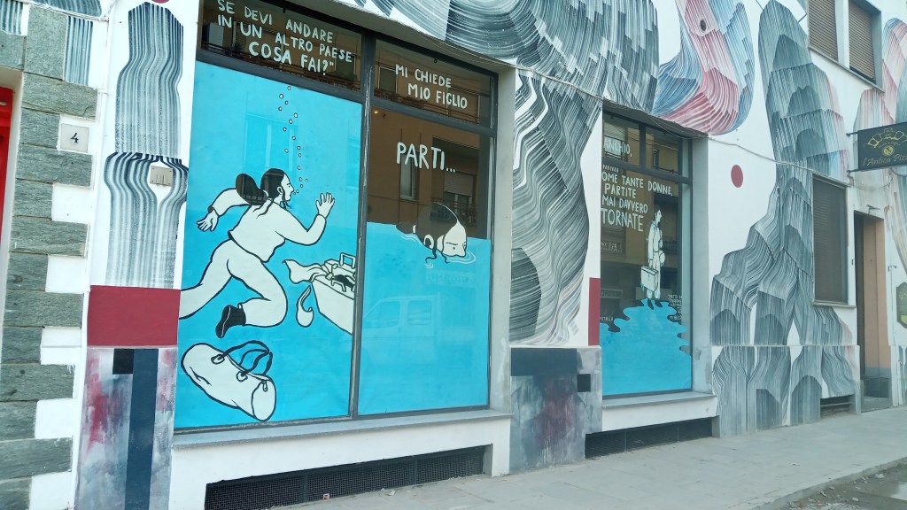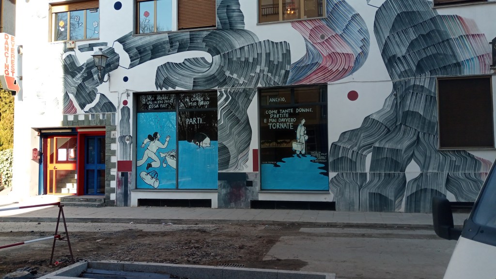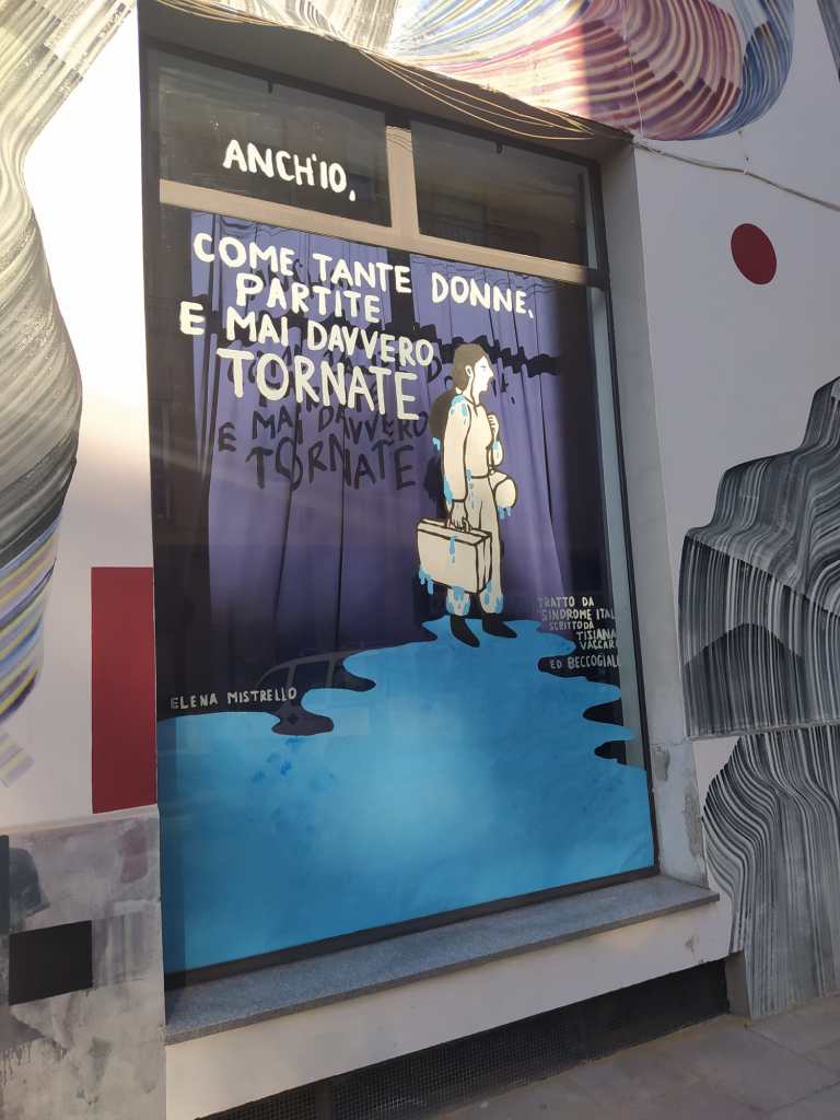 La vetrina a tema intercultura è stata realizzata all’interno del progetto “Vetrina d’artista” di Industria scenica di Vimodrone. Si tratta di un’installazione temporanea, il suo allestimento è durato da Gennaio 2022 a febbraio 2022. Il tema, scelto dal comitato cultura di quartiere insieme alla Circolo Everest, è stato declinato sul concetto di partenza e sospensione già presente nel fumetto “Sindrome Italia” ed. Beccogiallo, disegnato da me e scritto da Tiziana Francesca Vaccaro.