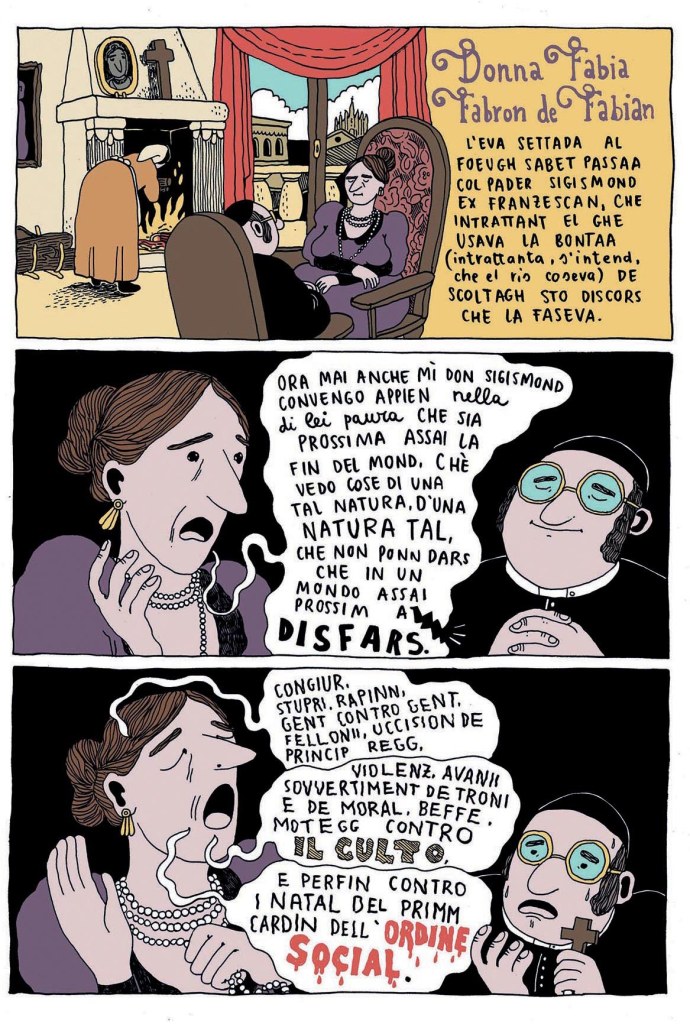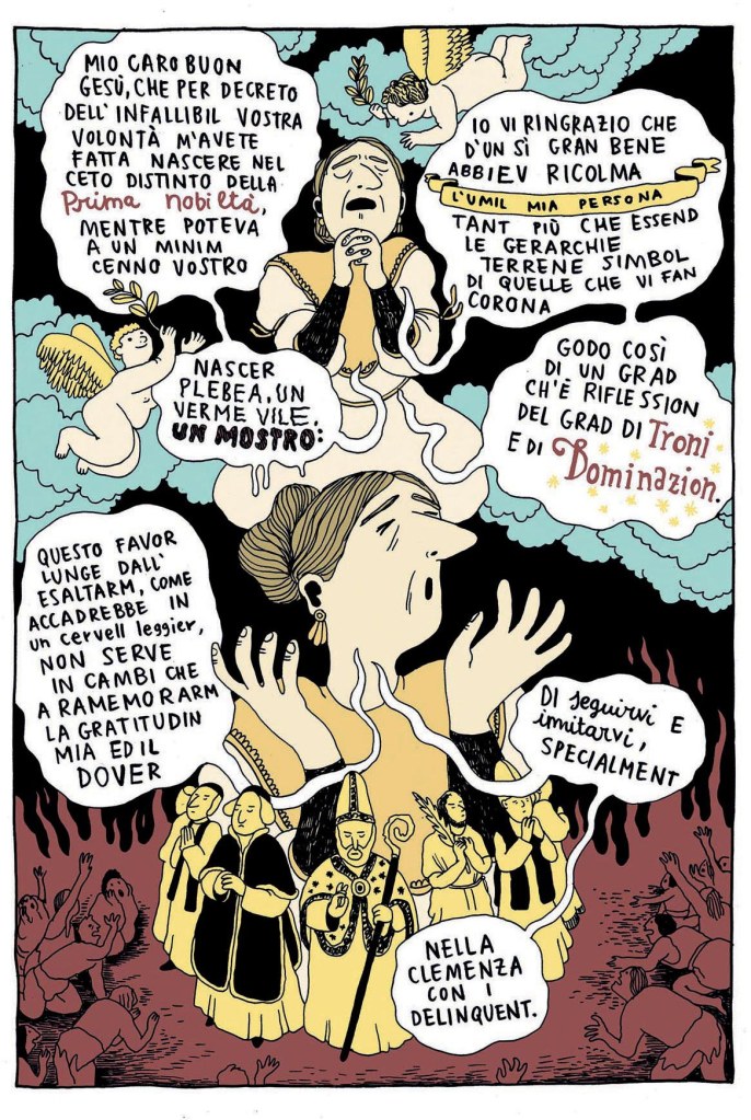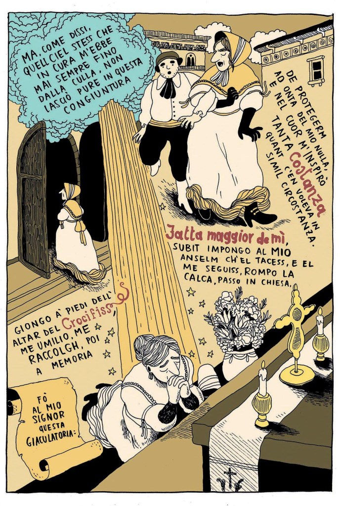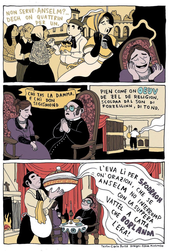“La preghiera”, poesia scritta da Porta nel 1820, è una finissima satira e critica alla nobiltà milanese. La nobildonna protagonista parla un misto di dialetto milanese, italiano con infiocchettare francesi che ne accentuano ignoranza e presunzione, è infatti essa stessa a collocarsi accanto a Dio, in quanto considera la sua casta eletta e superiore. Nel fumetto il testo è stato mantenuto intatto.