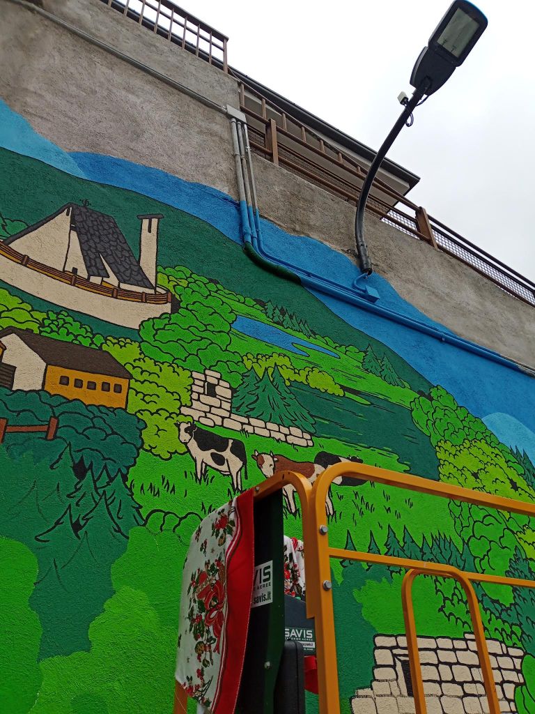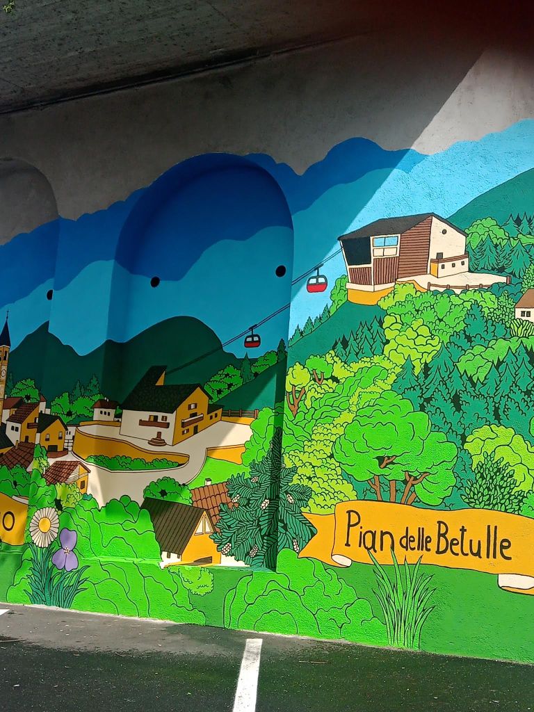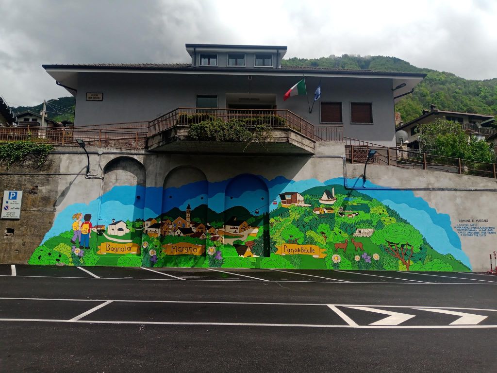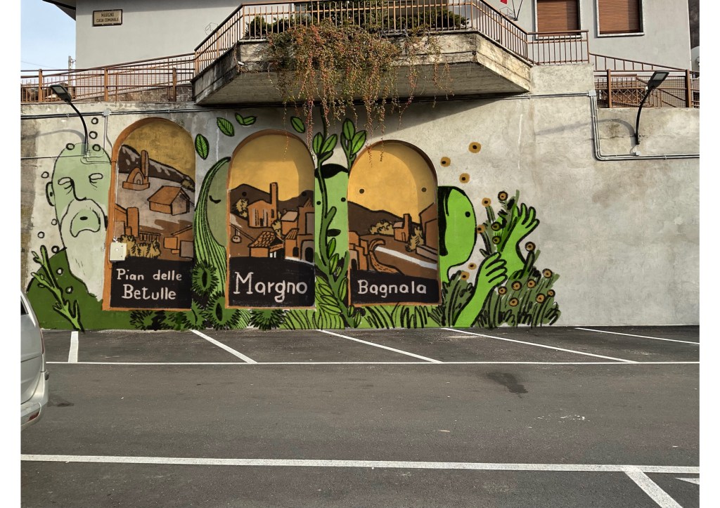 Il murales, realizzato nella piazza del mercato del paese, è una commissione del Comune di Margno (LC), per celebrare il paese e le sue frazioni. Molti degli elementi presenti nel murales sono precisa richiesta del sindaco e dei suoi abitanti, affinché questi vi sentissero rappresentati. Il murales ritrae le chiese principali delle frazioni di Margno, Bagnala e Pain delle betulle e molto paesaggio, in quanto elemento fondamentale della vita del paese. Il murales è stato realizzato interamente con colori al quarzo, ed è grande 20 metri x 6 metri.