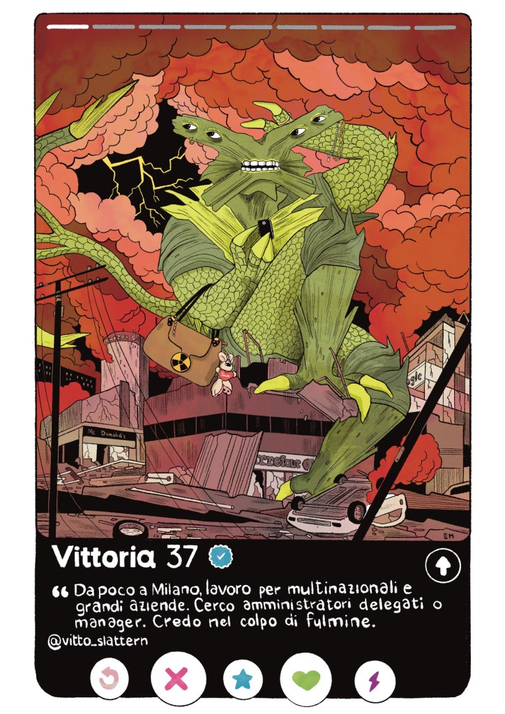 “Vittoria” è il mio contributo alla mostra ed è ispirata al leggendario kaiju Slattern, che letteralmente significa anche donna sporca o sgualdrina. Così nella mia versione il mostro diventa una signorina per bene che si prende le sue meritate vittorie sugli uomini e i centri commerciali che infestano le città.