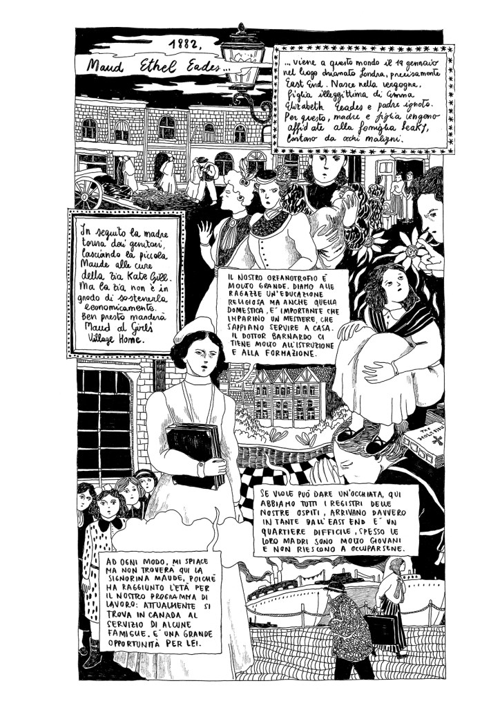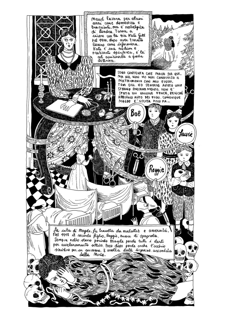 “La signorina Maude non è in casa” è una breve biografia onirica di Magde Gill, artista e spiritista di fine ‘800, originaria dell’East End (Londra). Il fumetto racconta la vita drammatica e piena d’arte di Gill, attraverso le parole delle donne che l’hanno conosciuta, che hanno vissuto con lei e delle voci con cui Gill era in contatto nella sua vita terrena. In questo racconto ho cercato di immedesimarmi nello stile e nel tratto di Magde attraverso la sua ricca collezione di disegni, schizzi e l’immenso lavoro artistico che ha lasciato.
