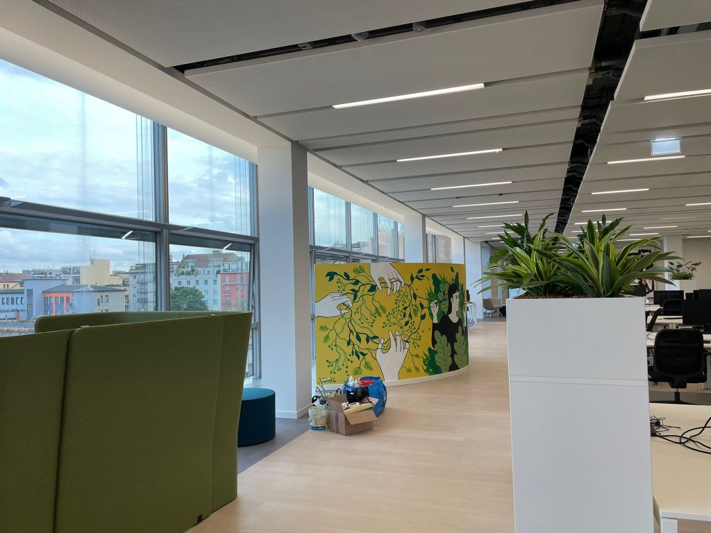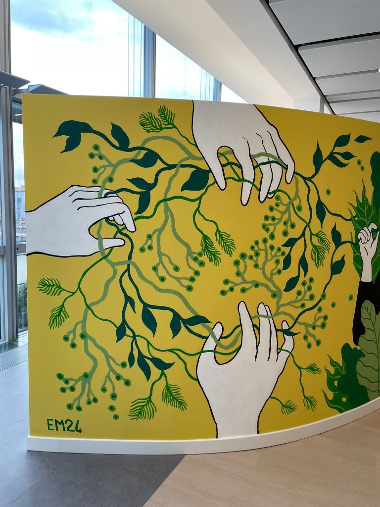 Murales su sostenibilità e retail negli spazi della nuova sede di Retex in via Monterosa, Milano.