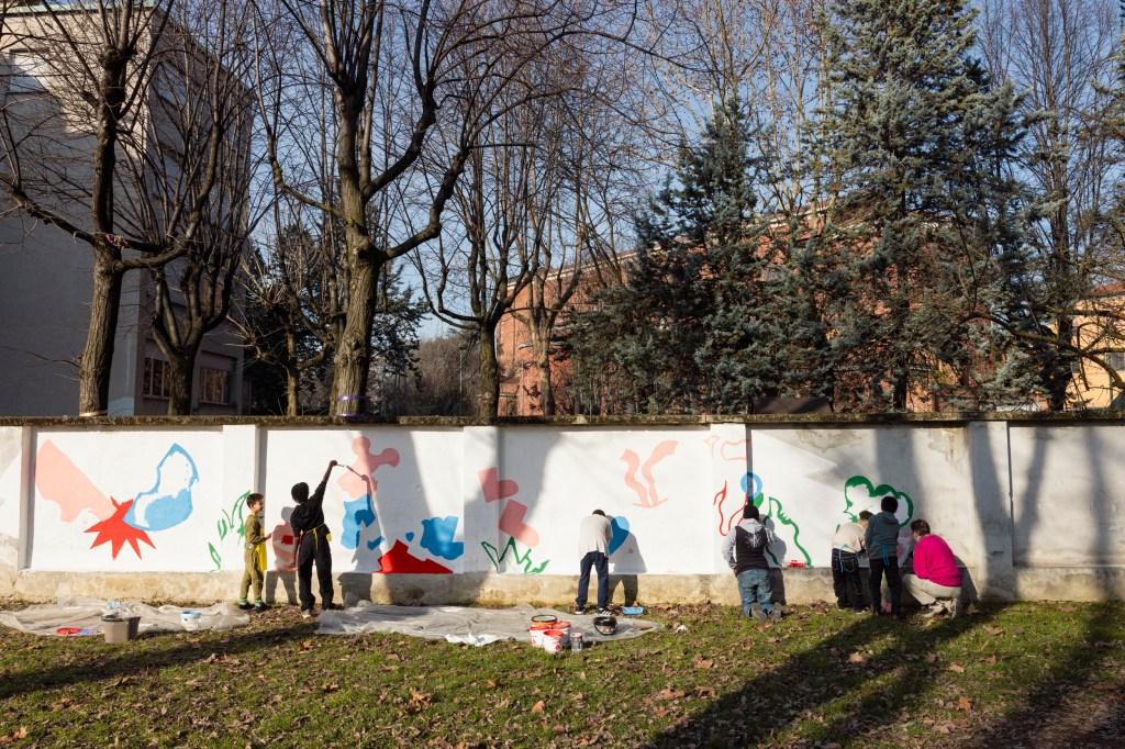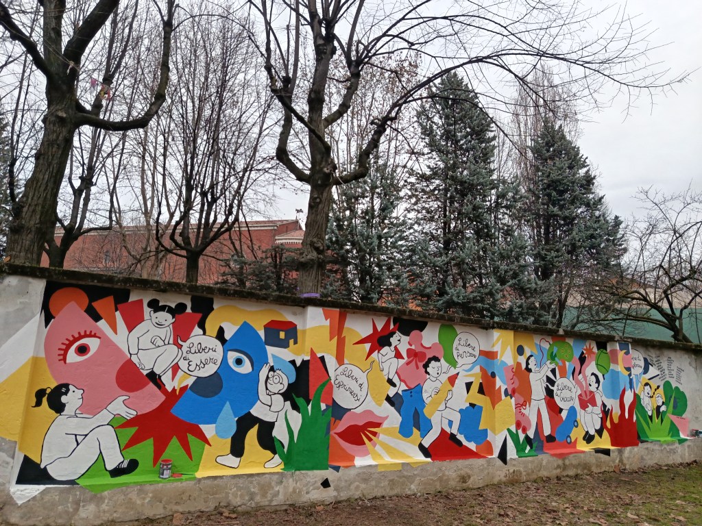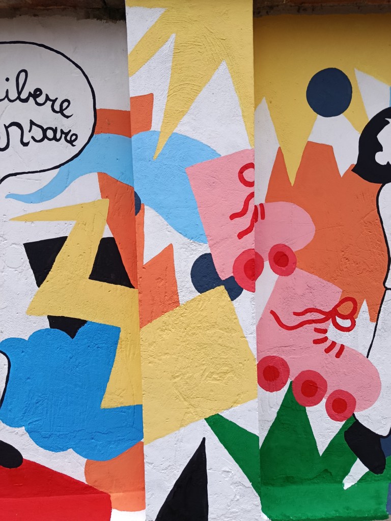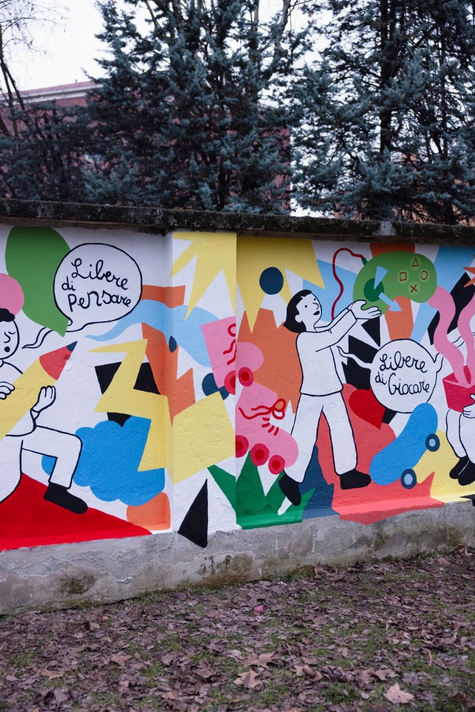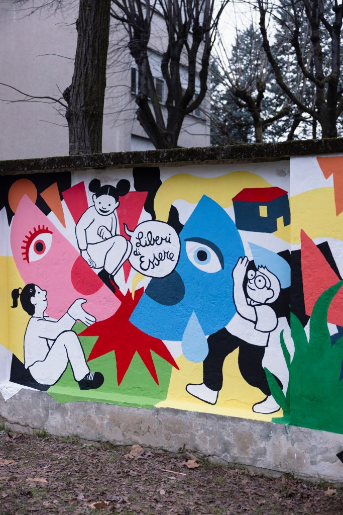 Liberi\e di essere è un progetto promosso da Telaio delle Arti e e Qubi rete Municipio 7 Milano sul tema della Parità di Genere. Con Mariella Martucci, autrice e sceneggiatrice, abbiamo progettato e tenuto un laboratorio di arte per le classi quinte della Scuola Elementare Radice di Milano. Il laboratorio rifletteva sulle tematiche della parità di genere attraverso il gioco, il disegno, i colori e il collage. A partire da quanto emerso, ho progettato un murale che riflettesse immagini e pensieri nati dai bambini e dalle bambine. Il progetto teneva conto delle loro idee e suggestioni e anche della fattibilità tecnica, per permettere loro di essere coinvolti anche nella fase di pittura del muro, pur mantenendo una coerenza generale. Il tema del murale è un viaggio attraverso gli stereotipi, un’esplosione di colori e ritagli, che ricorda i collage, ma anche un sovvertimento di forme e colori, affinché ognuno\a possa trovare i propri.