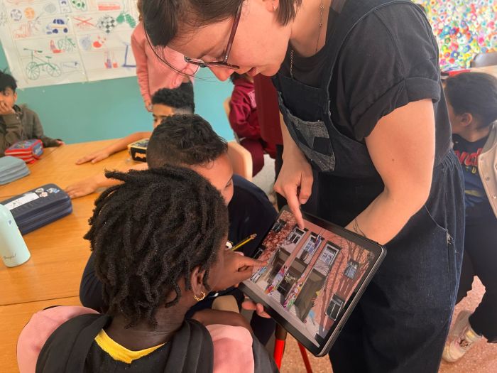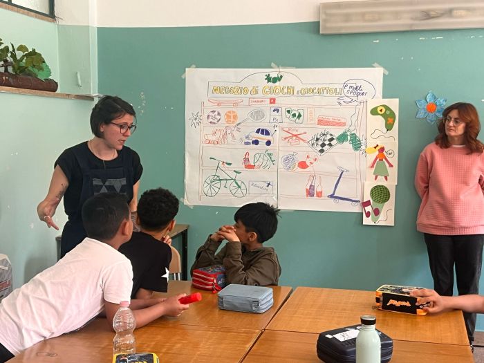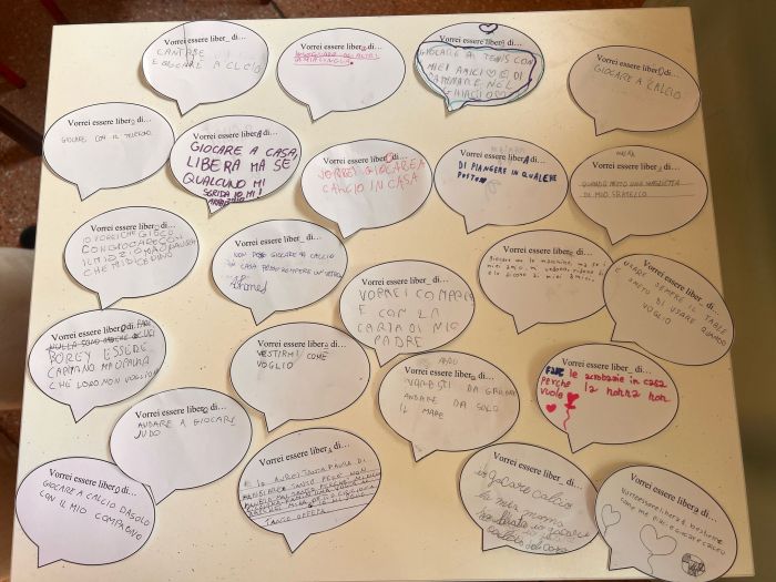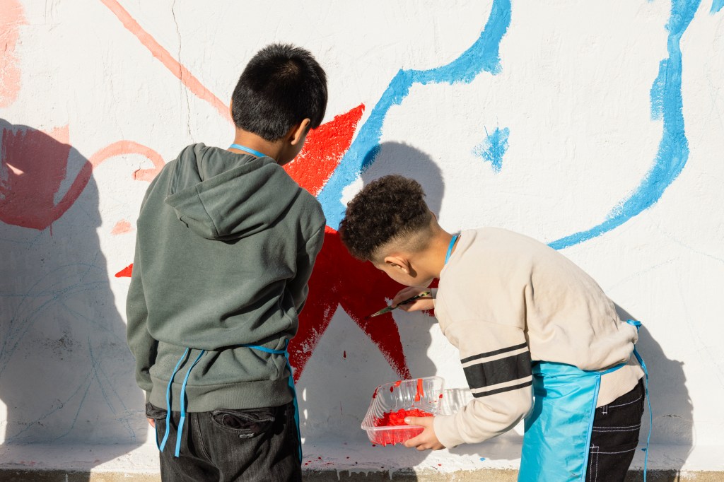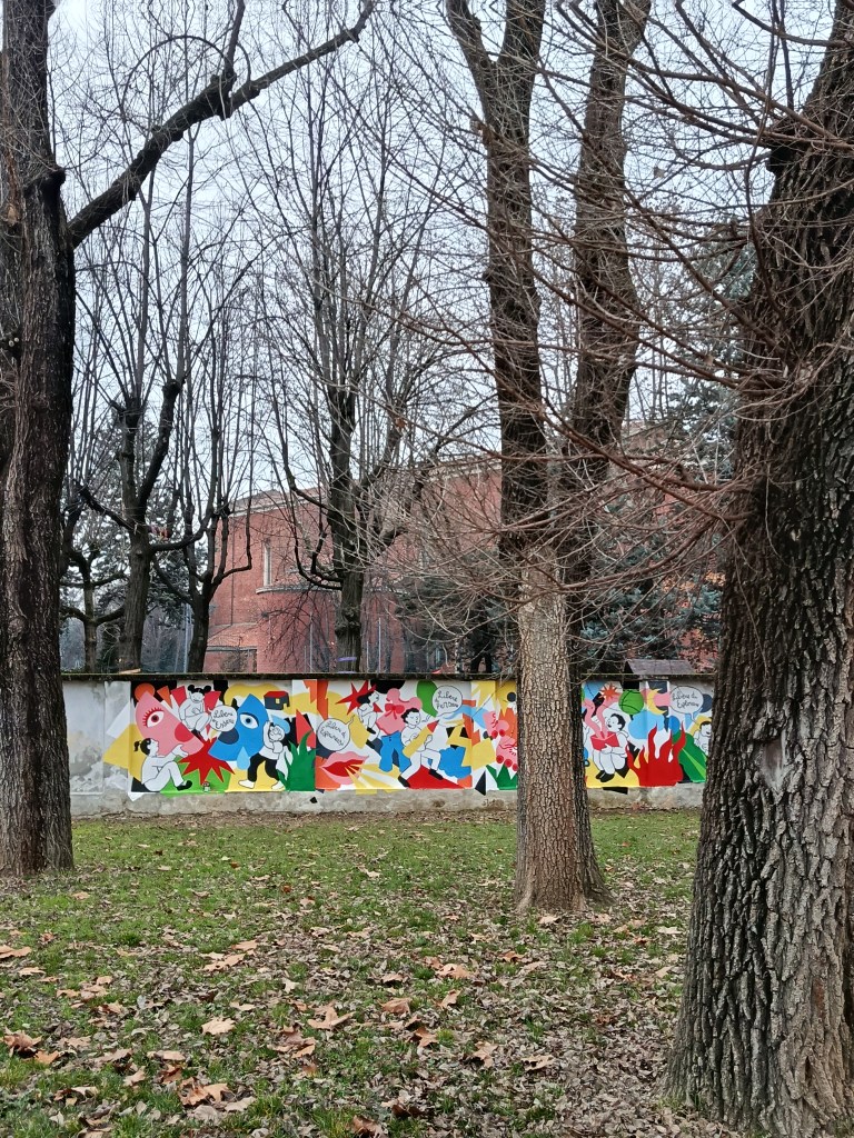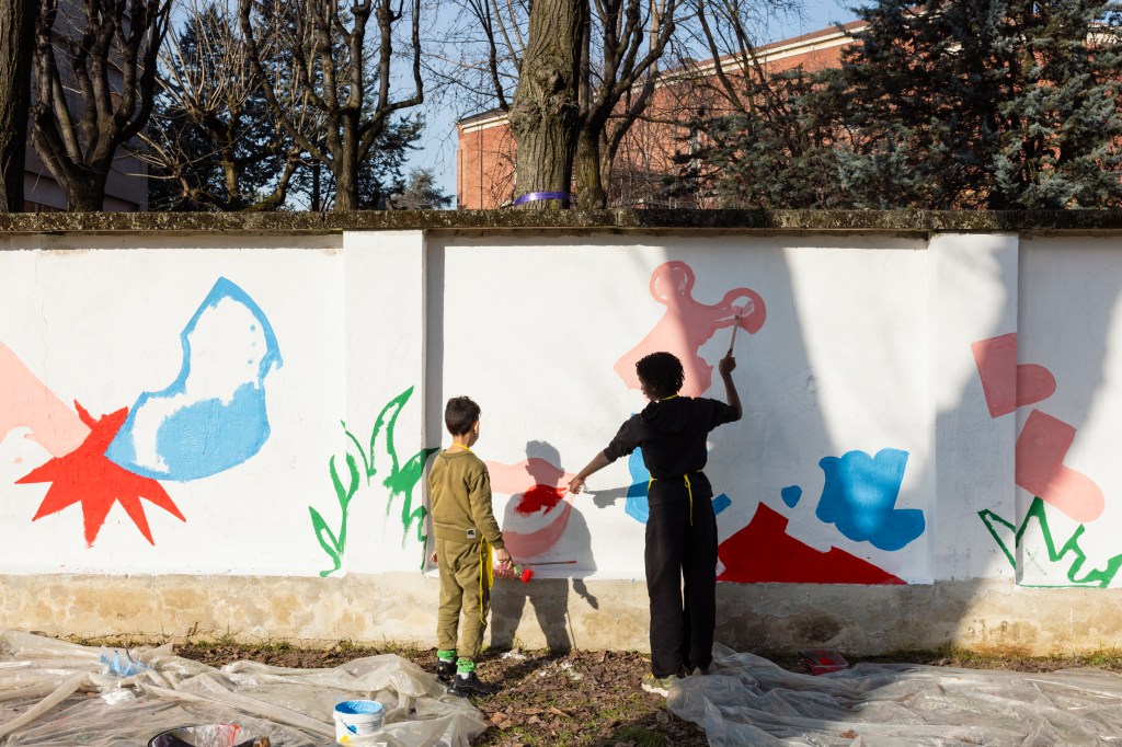 Liberi\e di essere è un progetto promosso da Telaio delle Arti e e Qubi rete Municipio 7 Milano sul tema della Parità di Genere. Con Mariella Martucci, autrice e sceneggiatrice, abbiamo progettato e tenuto un laboratorio di arte per le classi quinte della Scuola Elementare Radice di Milano. Il laboratorio rifletteva sulle tematiche della parità di genere attraverso il gioco, il disegno, i colori e il collage. A partire da quanto emerso, ho progettato un murale che riflettesse immagini e pensieri nati dai bambini e dalle bambine. Il progetto teneva conto delle loro idee e suggestioni e anche della fattibilità tecnica, per permettere loro di essere coinvolti anche nella fase di pittura del muro, pur mantenendo una coerenza generale. Il tema del murale è un viaggio attraverso gli stereotipi, un’esplosione di colori e ritagli, che ricorda i collage, ma anche un sovvertimento di forme e colori, affinché ognuno\a possa trovare i propri.