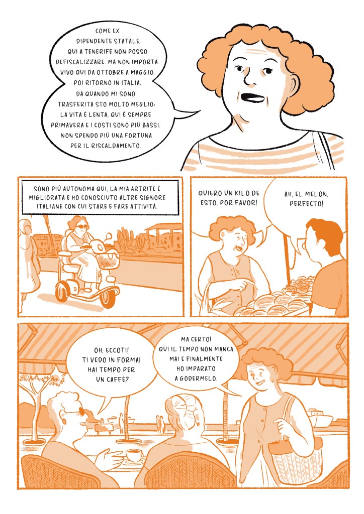 “Geografie della Pensione” è un fumetto su commissione di divulgazione scientifica nato da una ricerca sulle mobilità e migrazioni dei pensionati italiani a cura di Alice Lomonaco e Marco Alberio del dipartimento di Sociologia dell’Università di Bologna, sotto il coordinamento scientifico dello stesso Marco Alberio. Il lavoro restituisce, in forma narrativa e visiva, alcuni risultati emersi da 3 anni di ricerca qualitativa, interviste e osservazione sul campo, provando a rendere accessibile la complessità delle traiettorie biografiche, delle disuguaglianze e delle ambivalenze che attraversano l’invecchiamento in mobilità.