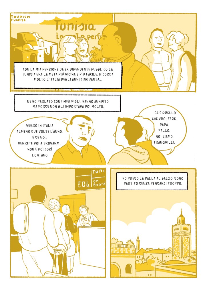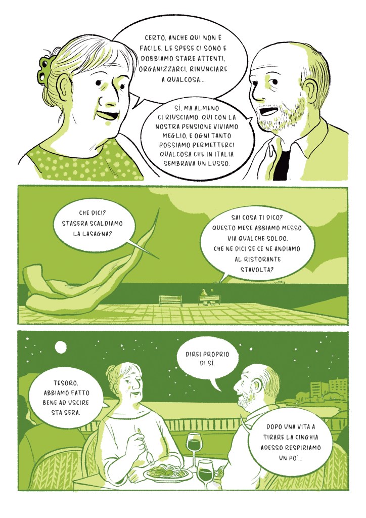 A partire dalle ricerche fatte da Alice Lomonaco e Marco Alberio, ho disegnato quattro storie simboliche prototipiche di pensionamento e immigrazione. Di seguito alcune tavole estratte: